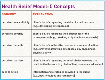 The HBM has five core concepts: perceived susceptibility, perceived severity, perceived benefits, perceived barriers and cues to action (see “Health Belief Model: 5 Concepts,” above). The strongest predictors of behavior are perceived benefits and perceived barriers (Jones, Smith & Llewellyn 2014). One of the biggest drawbacks of the HBM is that it does not weigh the economic, environmental or socio-structural factors affecting change.