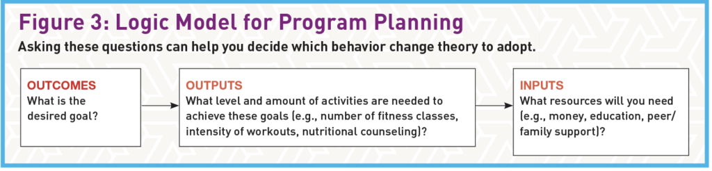 Avoid the urge to depend on personal preference and familiarity when choosing a behavior change theory. Using a logic model (see Figure 3) can help you choose wisely.