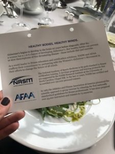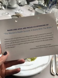 Speakers at the Summit emphasized that good habits, especially diet and exercise, can prevent or slow the symptoms of this devastating disease. That closely aligns with NASM/AFAA’s scientifically rigorous focus on healthy bodies/healthy minds. “Lifestyle changes, including diet and exercise have been proven to keep the brain healthy, said Jill Travis, AFAA Club Partnership Advisor. Who better to spread the word than NASM/AFAA.”