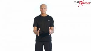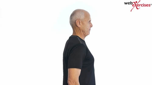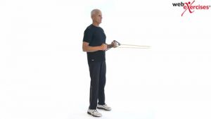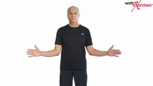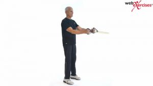 Begin by standing tall, shoulders should be back and head up. Bend elbows to 90 degrees and keep elbows near sides. While maintaining good posture, draw shoulders back squeezing shoulder blades together. A stretch may be felt in chest and front of shoulder. Do not allow shoulders to rise upward. Perform 2 sets of 8 repetitions.