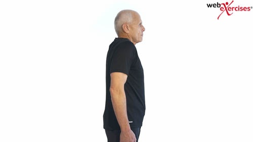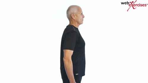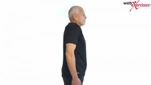 Begin by standing tall, shoulders should be back and head up. While maintaining good posture, lift the shoulders upwards without rounding shoulder forward. Then lower shoulder downward while squeezing scapula together, then releasing back to neutral again without rounding forward. Perform 2 sets of 8 repetitions.