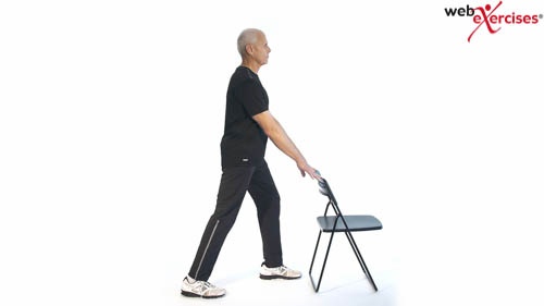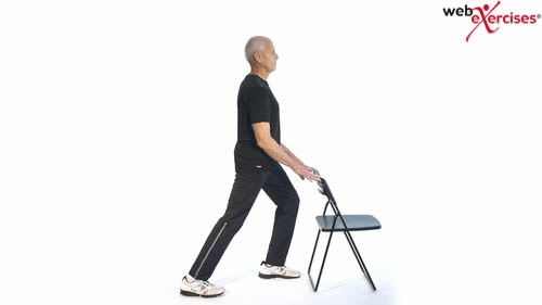 Begin standing with leg to be stretched extended behind body. Leg should be straight with heel on the ground. Use a counter or the back of a sturdy chair (without wheels) for support. Slowly lean forward, putting weight onto front leg while maintaining straight leg and heel-to-floor contact. A gentle stretch should be felt in the upper calf muscle. Hold for 20 seconds and then repeat on opposite side.