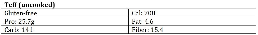 Teff is one of the smallest grains in the world, about the same size as poppy seeds. Because of its tiny size, teff is eaten in its whole form or ground into flour. It is very high in calcium (347mg), is gluten-free, and also high in resistant starch that is beneficial for blood-sugar management.