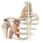 The tight pec minor may squeeze the brachial plexus (i.e., pec minor syndrome) causing TOS. Further, it is important to consider poor breathing patterns as non-optimal diaphragm function could cause overactive scalenes and pec minor (secondary respiratory muscles), which may again compress the vessels as they pass through the musculature.