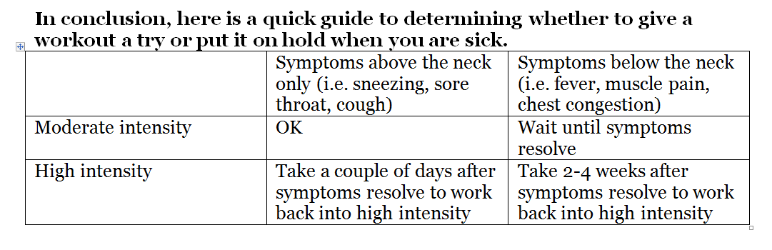 - Avoid exercise if you have a fever, symptoms below your neck (i.e. muscle pain or chest discomfort)
