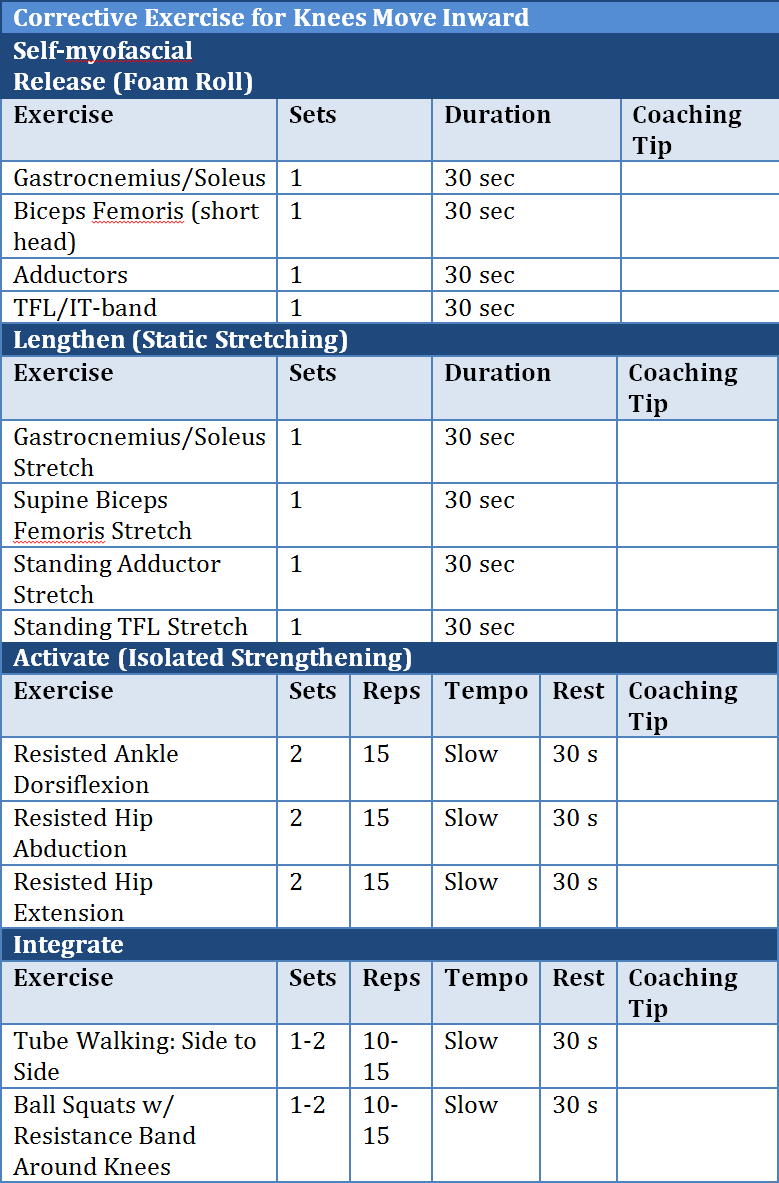 Below is a sample corrective exercise program for a client with knees that move inwards.