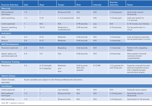 You will begin to notice some similarities between all of the phases as we move forward because, at a program design level, many of the characteristics we are using across the different phases are the same. The main difference is variations in acute variables (i.e., sets, repetitions, repetition tempo, and rest periods) and exercise selection, which we will touch on below.