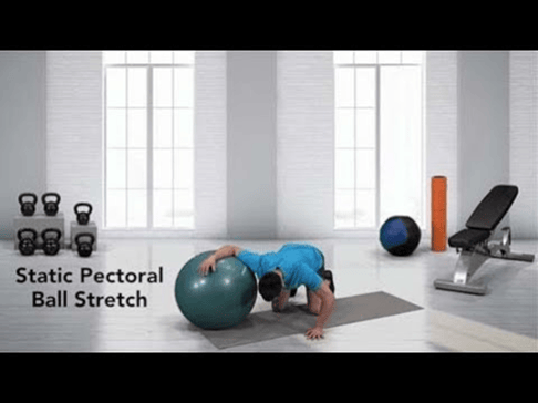 The arm is placed with hand slightly above the hear and lower arm is placed on the stability ball. Allow the chest to sink down until a stretch is felt in the pectoralis major. Hold the stretch for 30 to 60 seconds.
