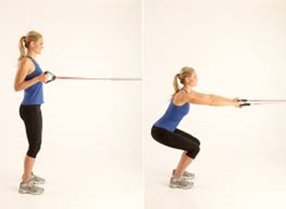 Grip a resistance band or cable machine. Retract the shoulder blades and bend the elbows to create a rowing motion. Release and squat. Stand up and repeat for the desired number of repetitions.