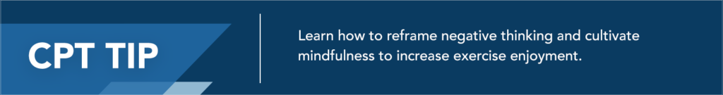 Here are some tips on how to start cultivating mindfulness to notice self-talk, and reframe thinking to better enhance exercise behaviors.