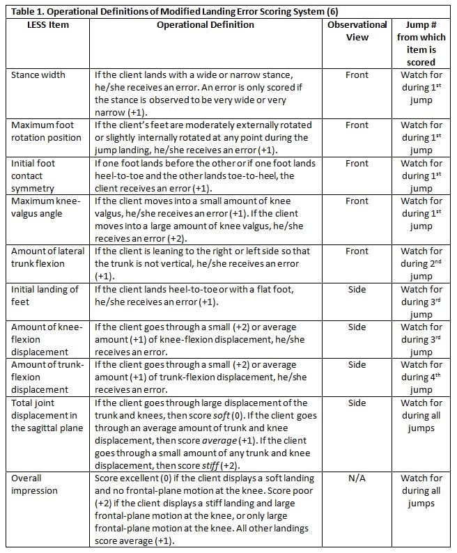 The purpose of this article is to discuss the validity and usability of the Landing Error Scoring System (LESS). The LESS is a movement screen used to identify specific movement patterns of the lower extremities that may increase an individual’s risk for noncontact ACL injury (6).