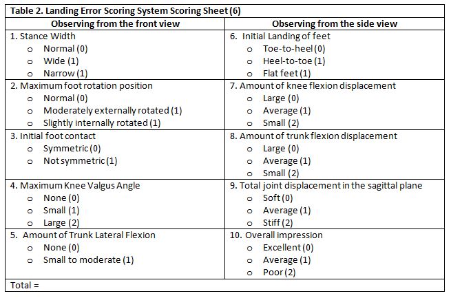 6. Padua DA, Boling MC, DiStefano LJ, Onate JA, Beutler AI, Marshall SW. -56. Reliability of the landing error scoring system-real time, a clinical assessment tool of jump-landing biomechanics. J Sport Rehabil. 2011 May;20(2):145-56.