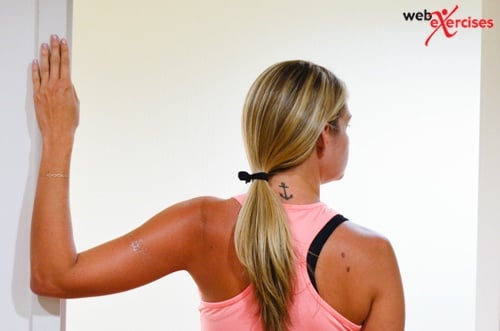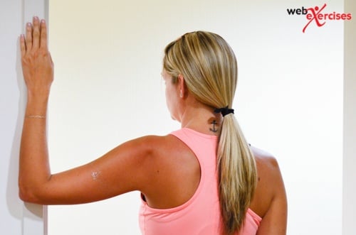 Place forearm on wall, or doorway, with elbow bent at 90º. Elbows should be slightly below shoulder level. While maintaining forearm contact, lean body into doorway until gentle stretch is felt in the chest and shoulder. Hold for 20-30 seconds. Beginners should start with 3 repetitions on each side.