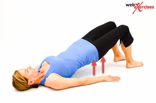 Begin lying on floor, facing up. Bend knees so feet are firmly on floor and arms extended. Activate core muscles. Lift hips off floor to attain a bridge position with knees, hips, and shoulders in alignment. Slowly return to start position. Initially, some cramping in the back of the thigh may develop. A simple hamstring stretch, before and after, may prevent this from occurring. Beginners should aim for 3 sets of 10 repetitions.