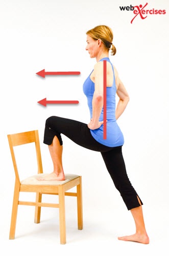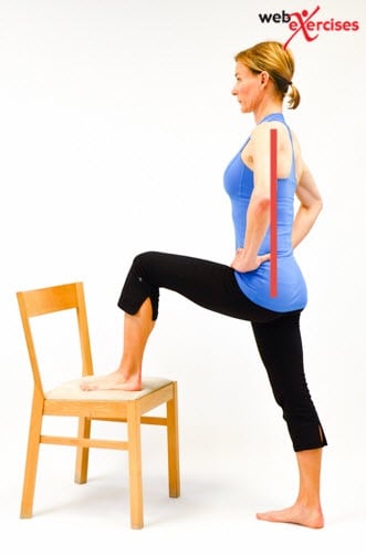 Begin standing in front of a chair about 18 inches away. Place one foot flat on the chair seat. Slowly allow hips to glide slightly forward until a gentle stretch is felt on the front of straight leg. Hold for 20-30 seconds. Beginners should aim for 3 sets each per side.