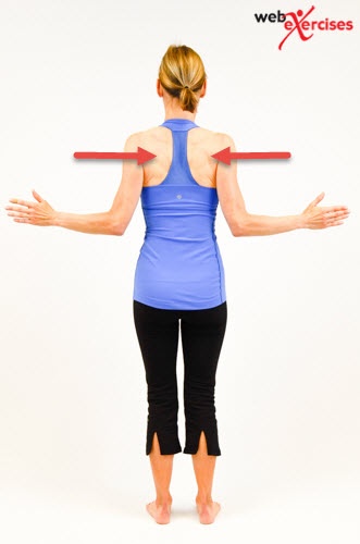 Begin standing with good posture. Shoulders should be back and head up. Bend elbows to 90 degrees and keep elbows near sides. While maintaining good posture, draw shoulders back squeezing shoulder blades together. A stretch may be felt in the chest and front of shoulder. Do not allow shoulders to raise upward. Hold for 5-10 seconds. Beginners should start with 3 sets of 5 repetitions.