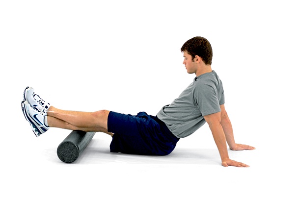 A. Place a foam roll under the mid-calf. Cross left leg over right.