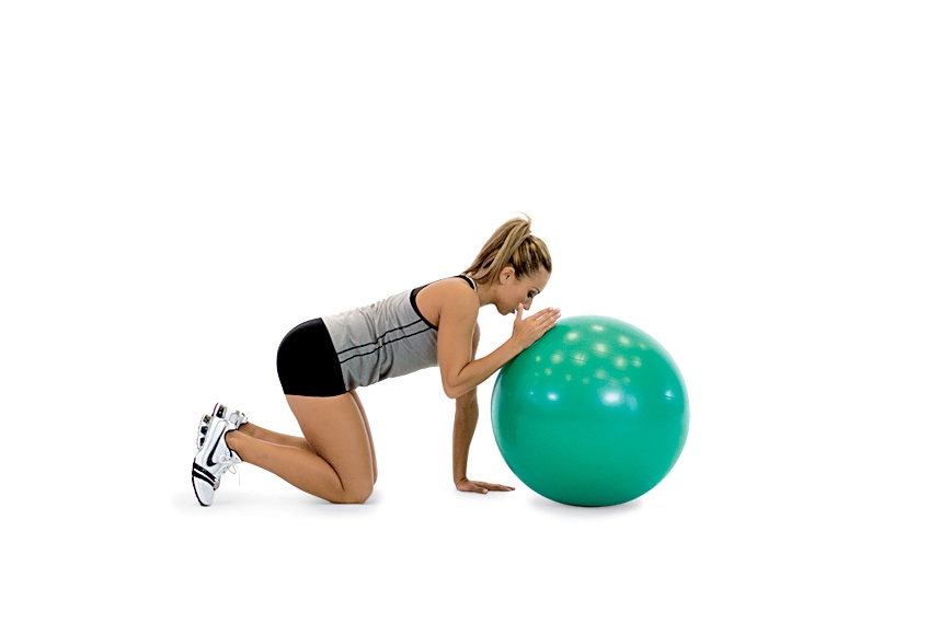 A. Kneeling, place one arm on the ball, with thumb pointing up.