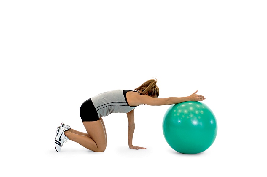 B. Draw navel toward spine and slightly round the back. Slowly reach the arm straight out by rolling the ball forward. Hold for 30 seconds, then switch sides.