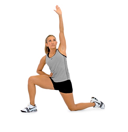 A. Kneel on one leg, with the other leg bent at 90 degrees in front. B. Contract the glutes and shift forward. Raise the arm that is on the same side as the knee touching the ground, and rotate the hip toward the opposite side until a mild stretch is felt in the front of the pelvis. Hold for 30 seconds, then switch sides.