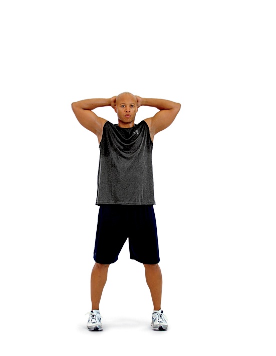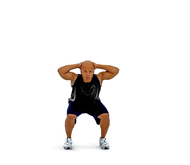 A. Stand straight, feet shoulder-width apart. Draw navel toward spine. Place hands behind head, pulling shoulders and elbows back. B. Slowly lower to a squat position (toes straight ahead, knees in line with toes). Extend hips, knees, and ankles back to standing. Repeat 10 times.