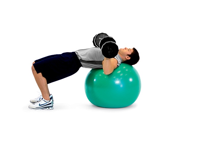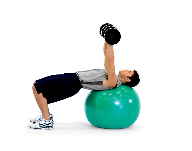 A. Holding a pair of dumbbells, lie back on the ball, keeping a bridge position with feet flat on the floor, shoulder-width apart. B. Press the dumbbells straight up by contracting chest and extending elbows. Hold, then slowly return to starting position. Repeat.