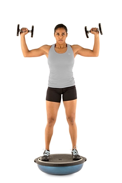 A. Holding a set of dumbbells, stand on the flat side of a BOSU trainer, feet shoulder-width apart. Raise the dumbbells to shoulder height, elbows pointing out. B. Press arms directly overhead. Slowly lower to the starting position. Repeat.