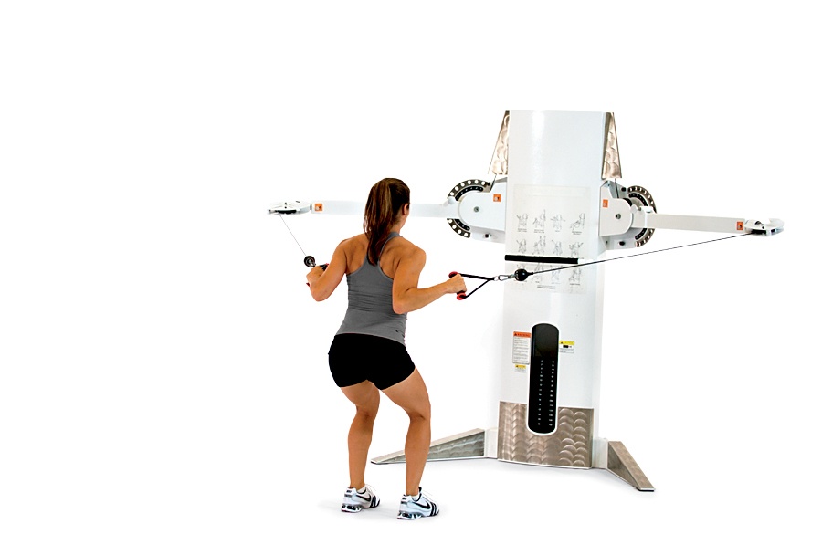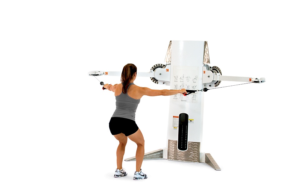 A. Stand facing a cable machine, feet shoulder-width apart, toes pointing ahead. Hold the cables with arms extended at chest level. B. Slightly flex the knees, then row the cable by flexing the elbows and pulling the shoulder blades together. Slowly return to starting position. Repeat.