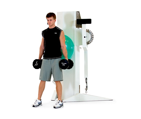 A .Face a cable machine, with feet shoulder-width apart, toes pointed straight ahead. Hold cables at the sides of the body. B. Slowly squat, bending knees and keeping chest up and feet straight. Contract glutes and press through the heels while returning to the starting position. Repeat. Progress to perform while standing on a core board or the flat side of a BOSU trainer.