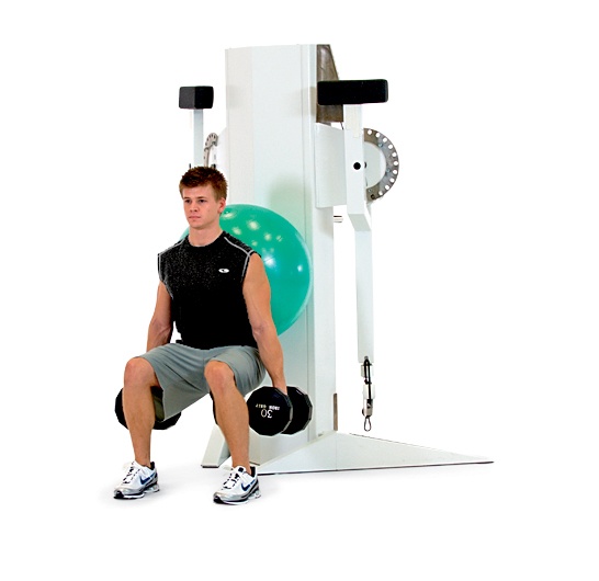 A. With a dumbbell in each hand, stand with feet shoulder-width apart and back on a stability ball placed against a wall. B. Slowly squat, bending knees in line with toes and flexing hips. Allow the pelvis to sit back under the ball while maintaining a neutral spine. Contract glutes to rise, placing pressure on heels as knees extend. Repeat. Progress to incorporate an unstable surface such as a core board.