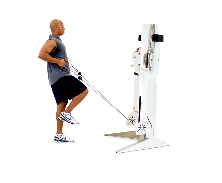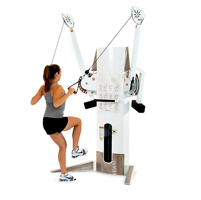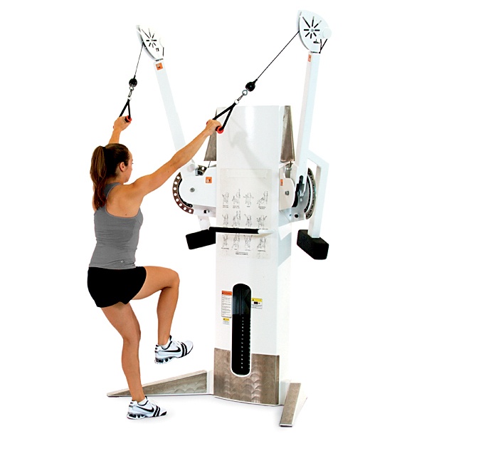 C. Stand with leg off the floor, pulling the handles to the bottom of the rib cage, with elbows in and shoulder blades squeezing together. Keep the leg raised while extending arms. Repeat, switching legs between sets.