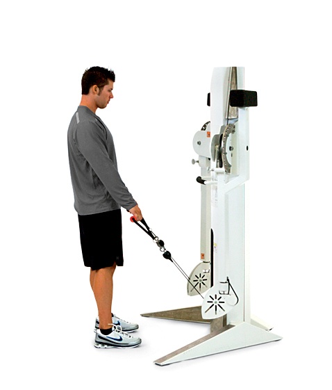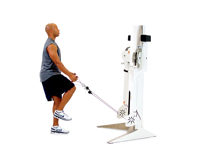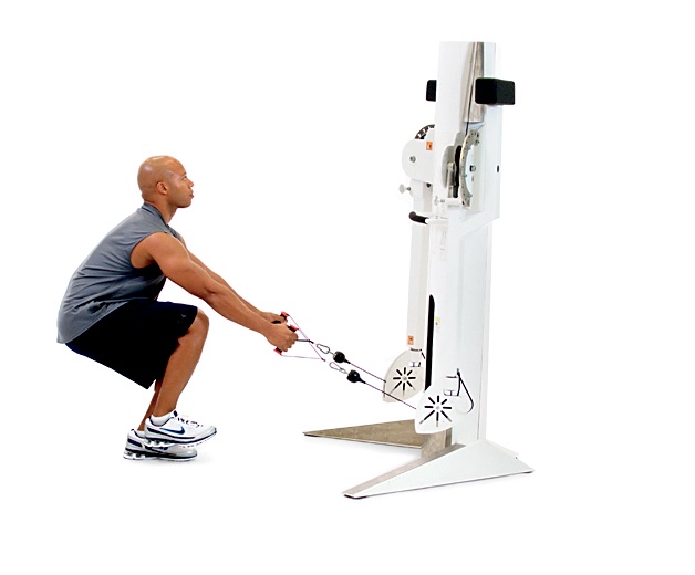 A .Face a cable machine with a grip in each hand, arms extended toward the floor, palms inward. Raise one leg off the floor. B. Keep arms extended with back straight and squat until thighs are at least parallel to the floor, keeping knees from going in front of toes.