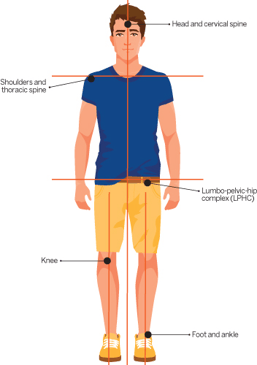 Static posture is commonly visually assessed in a relaxed standing position with no shoes, from an anterior, lateral, and posterior view (Figure 1). The five kinetic chain checkpoints (i.e., feet and ankles, knees, the lumbo-pelvic-hip complex or LPHC, shoulder complex, and the head and neck) are assessed from the three views, as the certified health and fitness professional attempts to witness any deviations from optimal or ideal posture in the standing position.