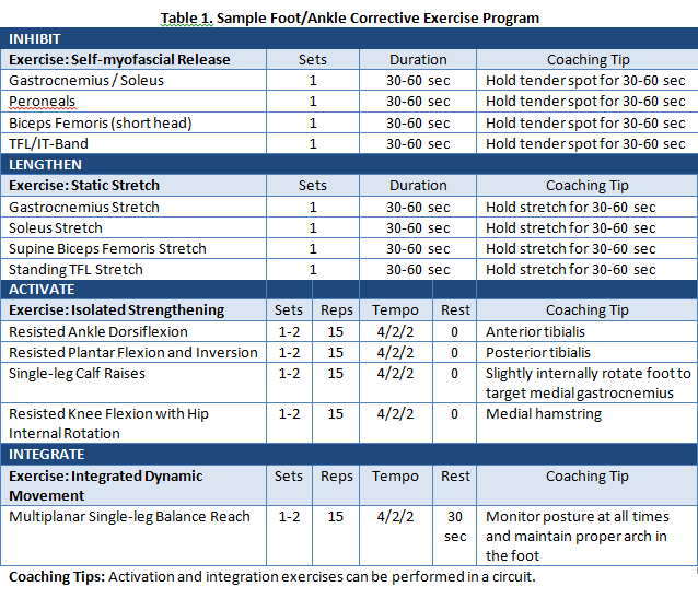 Table 1 is an example of a corrective exercise program for an athlete with foot/ankle dysfunction. In most cases restoring adequate ankle dorsiflexion is paramount (4). Stretching should be relatively pain-free and can be performed several times a day. Other exercises should be incorporated to strengthen the musculotendinous structures of the foot and improve proprioception. Calf strengthening can be done through heel raises and can be paired with exercises to strengthen the anterior tibialis, posterior tibialis and medial hamstrings. For more examples of corrective exercise programs (such as for knee or shoulder impairments), refer to NASM’s Corrective Exercise Specialist.