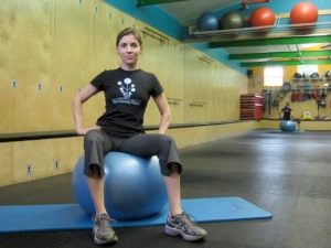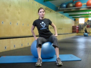 Sit on the ball with good posture. Move hips in small circles to the right. Try to use the core and not the legs. Then slowly move hips to the left. Then forward and back. Keep core tight and breathe normally.