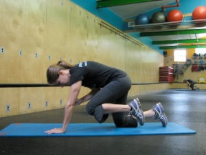 Begin on all fours with back straight, hips level, and core tight. Lift one leg straight behind, and the opposite arm directly in front. Reach and inhale. Bring knee in toward the elbow while squeezing the abs, round the back, and exhale. Complete repetitions on one side before switching.