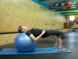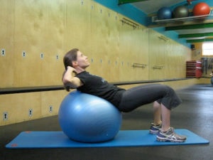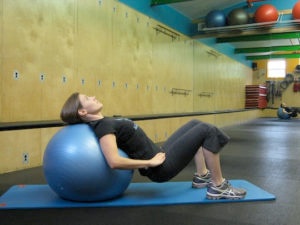 Start by sitting on a well-inflated stability ball, then slowly roll down until it fits comfortably on the lower back. Be sure the body feels balanced, placing the feet directly under the knees. Stabilize the neck by gently supporting the head. Exhale and roll shoulders slightly up off of the ball in a crunch. During the crunch, the hips press up and away from the ball while squeezing lower abdominals, glutes, and pelvic floor. Inhale and slowly return shoulders and hips to the start position. Be careful the ball does not slip out! This is a very short range of motion. Do not relax abdominals or stretch over the ball; the core should remain engaged throughout the exercise. If this is too complicated to start, just focus on the crunch without a pelvic tilt.