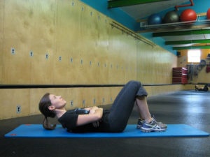 Lie on back with bent knees and feet flat on the floor. Use hands or wrap a towel or belly band around the waist to pull the abdominal muscles together. Inhale deeply to expand the belly. Slowly exhale while contracting the abdominals, pulling them inward, and raise head off the floor. Return to the starting position and repeat.