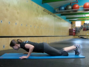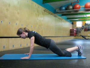 Start in a kneeling pushup position with the back/neck straight and core tight. Place hands in line with the chest, and wider than the shoulders. Slowly bend the elbows and lower toward the floor. Be sure not to sag the lower back down or raise hips too high. Press back up to starting position and exhale. If pushups hurt the wrists, they can be done on the fists/knuckles, using pushup handles, or grip dumbbells to keep wrists straight.