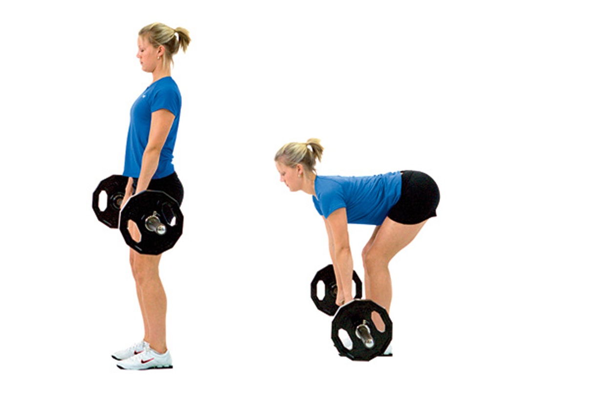 B Bend forward at the hips as you lower the bar to the floor (your knees will naturally bend slightly). Rise back to the starting position, concentrating on extending your hips as you stand.