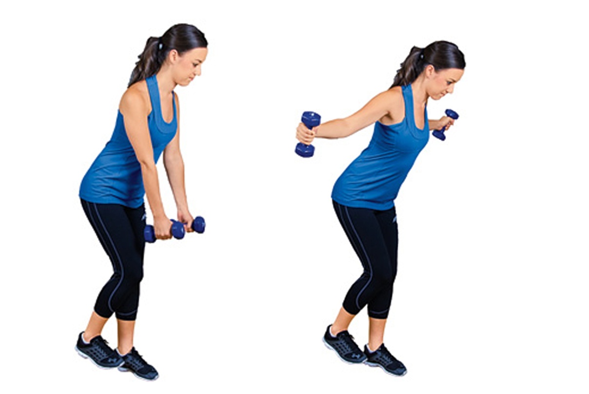 B Squeeze your shoulder blades together and raise the dumbbells up and out until the weights are at chest level. Reverse the move back to start. Repeat on your right foot. Alternate for a full set.