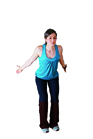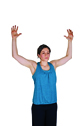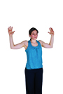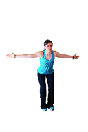 - Lift arms in front and slightly to the sides of the body at a 45-degree angle, keeping thumbs up (palms facing each other) and pinching shoulder blades back and down (this is the Y position).