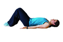 - Lie on back with knees bent, placing feet flat on the floor, shoulder-width apart. Arms are at sides with palms up. Tighten abdominals and contract glutes.